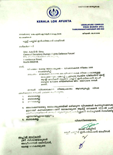 The Ayukta rejected the RTI application citing section 17(1) of the Kerala Lok Ayuta Act which says that information received by the Ayukta should be treated as confidential.